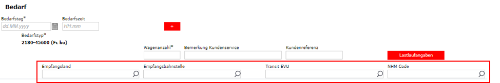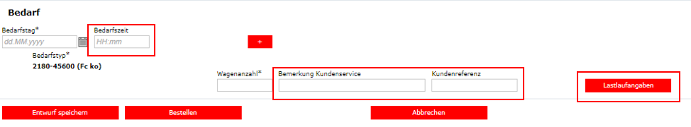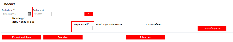 Nach dem Laden der Vorlage ist die Mindestanforderung für eine valide Leerwagenbestellung alle Pflichtfelder (*) zu befüllen. Die Pflichtfelder sind Bedarfstag und Wagenanzahl.